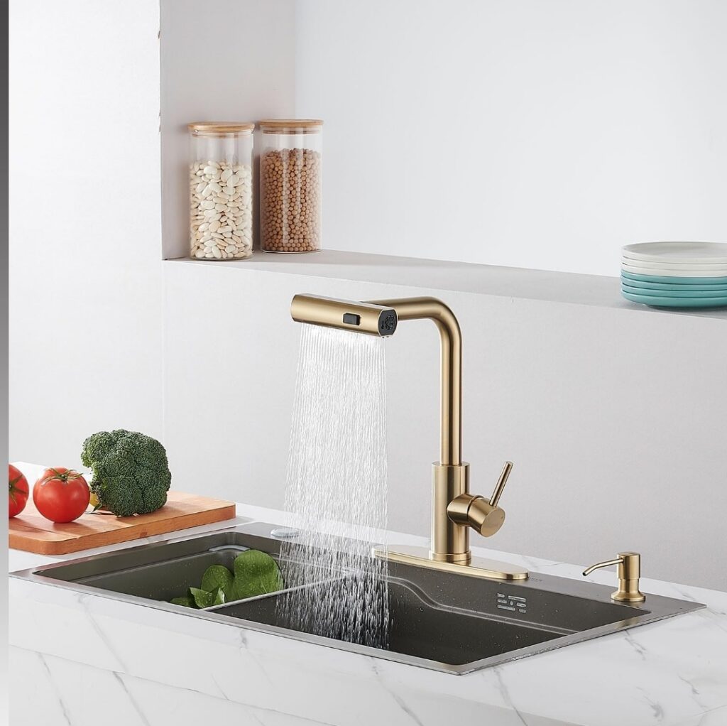 Kitchen Faucets with Pull Down Sprayer, Brushed Gold Waterfall Kitchen Sink